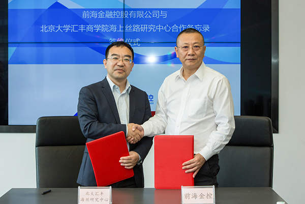 11月20日,北京大學匯豐商學院海上絲路研究中心(以下簡稱“北大匯豐海絲研究中心”)主任何帆一行到訪前海金融控股有限公司(以下簡稱“前海金控”),并與前海金控總經理孟曉共同簽署了合作備忘錄。根據合作備忘錄,雙方將在助力“21世紀海上絲路”倡議實施、推動粵港澳大灣區金融合作創新、發揮校企聯合國際高端智庫作用和促進國內外金融人才互動與交流等領域開展緊密合作。